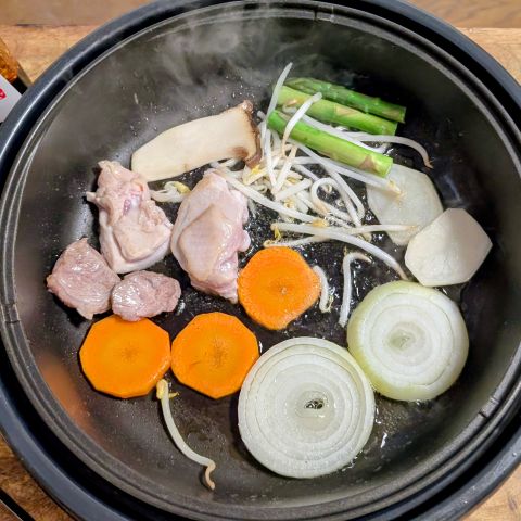 一人焼肉。お肉はコスパ重視で鶏モモ肉。それに豚のこめかみを少し買いました。