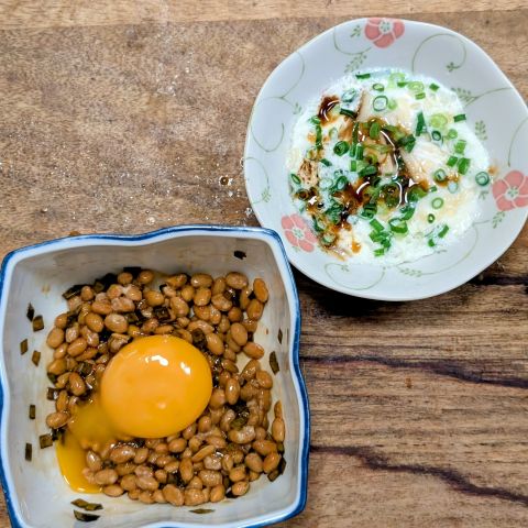 ニラ醤油納豆。生玉子の白身は納豆に含まれるビオチンという栄養素の吸収を妨げるというので、白身は豆乳シュレッドと小ネギを混ぜてチンしました。