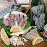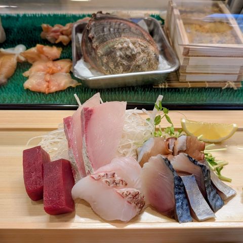 お刺身盛り。ここのお刺身は基本的に、1日か2日熟成したネタを使うみたいです。あとで「食べ比べてみて」と獲れたてのカンパチを1切れ出してくれました。サービスです。ありがとうございます。