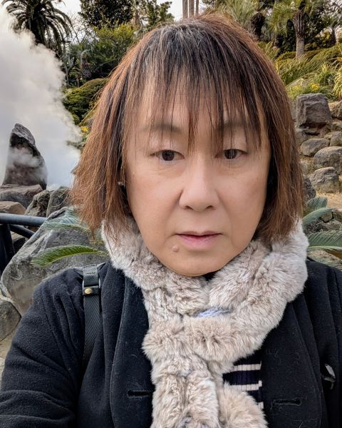 海地獄で自撮りしました。ちょっと寒かったのでマフラーをしています。