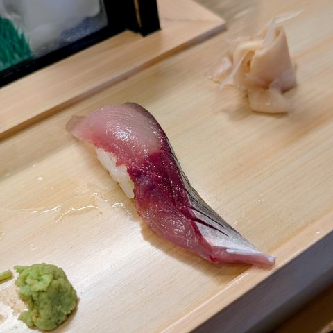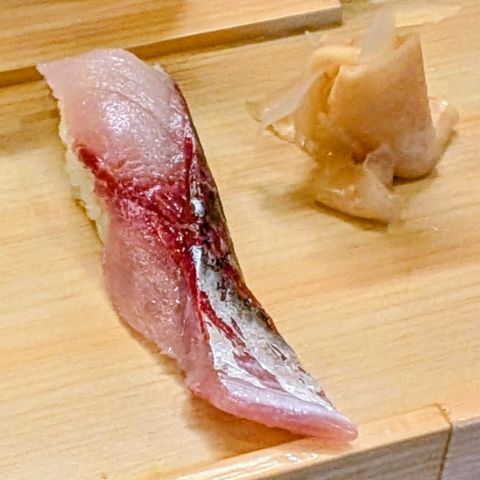 実は、刺し盛りに時間がかかるのではないかと思って注文した関アジの握りだったのですが、先に注文した刺し盛りから始めたので、後になりました。「今日は、何かお勧めがありますか?」と聞いたところ、メニューにない品として勧められたものです。