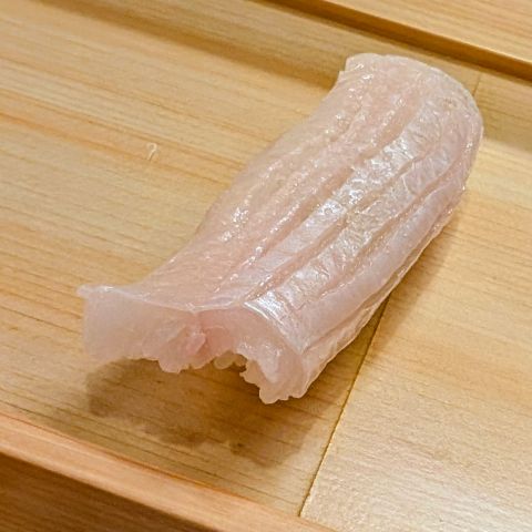 これは、「何か当ててみて」と言われて出されたら、まずわからないと思います。生アナゴです。メニューにはありません。最初に推薦されたのでいただきました。皮は剥いであるとのこと。こちらもコリコリして最高でした。ありがとうございます!