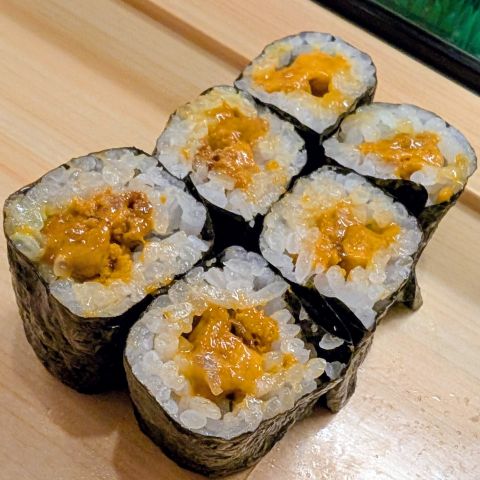 玉子焼きを食べたのですが、もう少し飲みたくなり、西の関をお燗で注文し、ウニ巻きも追加しました。
