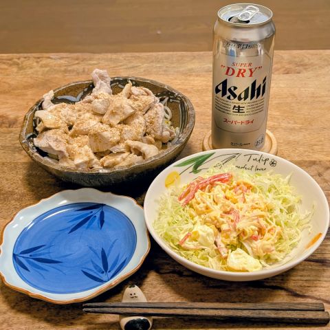 豚モモと鶏胸肉ともやしのごまドレサラダ、”カニ”玉サラダ。”カニ”はカニカマです。ヘルシーでありがたいです。