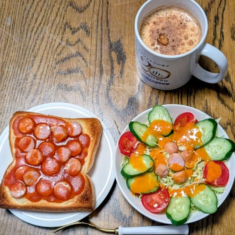 ピザトースト。チーズ代わりに豆乳シュレッドを使っているのですが、一番下に敷いてしまい、ただの赤いトーストになってしまいました。でも、おいしかったです。ありがとうございます。