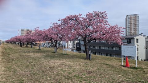 江戸川沿いの市川市側のサイクリングロード。市川橋まで1kmぐらいの地点に河津桜の並木があります。満開でした。ありがとうございます。