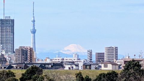 こちらは市川橋を越えて、約1kmぐらいのところにある、富士山と東京スカイツリーが隣接する写真スポットです。素敵な景色をありがとうございます。