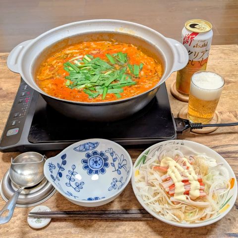 豚モツキムチ鍋とタマネギサラダ。低カロリーでヘルシーです。ありがとうございます。
