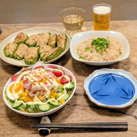 伴侶さんのリクエストでピーマン肉詰めです。油を使わずに焼いたのですが、これだけあるとカロリーが気になりますね。とはいえ、おいしいです。ありがとうございます。