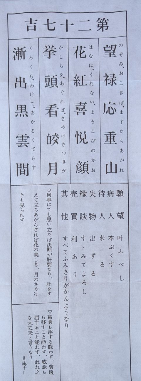 おみくじは吉でしたが、内容は今の私にピッタリと思いました。「願望 叶うべし」は力強いです。また「病人 本ぷくす」は、ネコなのですが、コマサがもう2カ月ぐらいお腹の病気で苦しんでいて、私もずっといろいろな神様・仏様に祈ってきたので、とても心強く感じました。