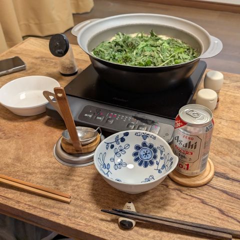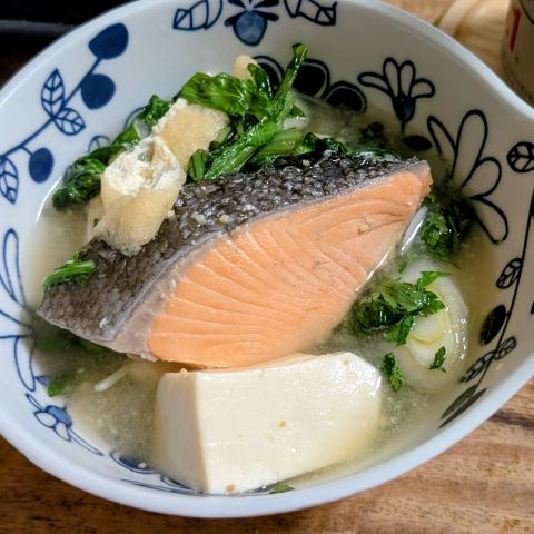 お出汁は、白だしと日本酒、お味噌、バターで味付けしました。具材は、鮭と油揚げ、お豆腐、えのき、長ネギ、水菜、春菊です。春菊はことのほかたっぷり入れました。