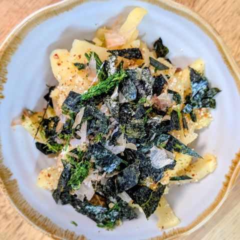 たくあんが残っていましたので、拍子木切りにして、那珂湊で買った(千葉産ですが)「ぶっかけ漁師飯」とお醤油をかけていただきました。