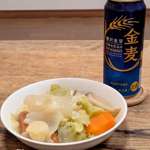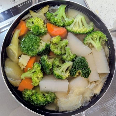 ポトフを作りました。大根が余っていたので、入れてみました。大根、ブロッコリーの茎、にんじん、じゃがいもは、圧力鍋で下ごしらえしました。蒸気が出て、ピンが上がってから弱火で5分。火を止めてから、ピンが自然に下がるまで待ちました。