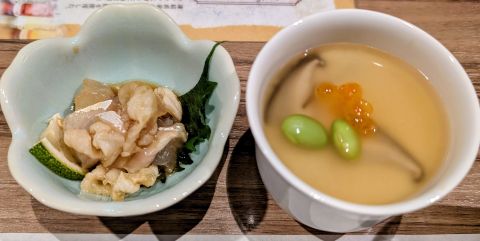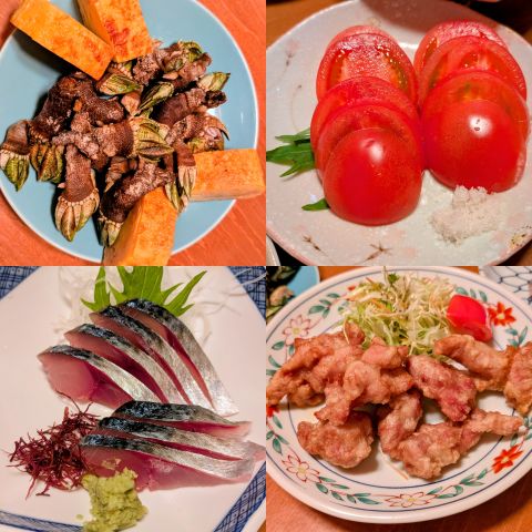 お通しが、厚焼き玉子とクマノテ(フジツボの一種)。大分はトマトがおいしいと聞いていたので、注文しましたが、確かにさっぱりした甘みがありました。サバは関さばかと思ったのですが、釣ったばかりのサバということでした。それと大分名物とり天。