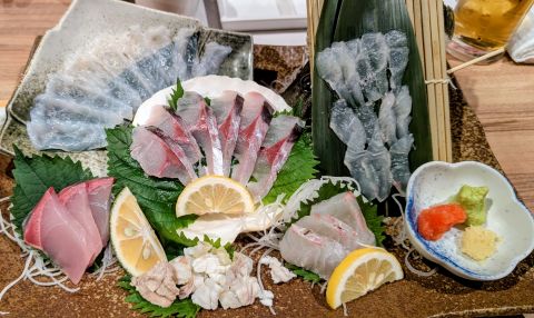 お刺身盛り。カワハギが名物のお店ですが、どのお魚もコリコリしておいしいです。ありがとうございます。