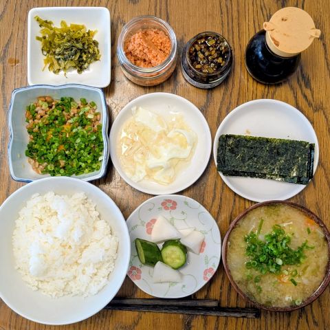 朝ごはんのようなお昼ごはん。さっそく大分土産のニラ醤油(上段の右から2番目)が活躍。納豆ご飯と最高の相性でした! ありがとうございます。
