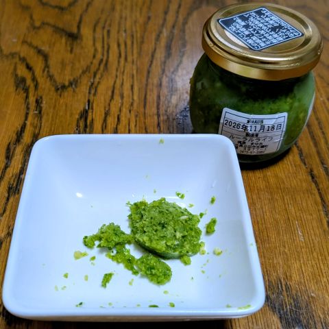 お鍋用に、生柚子胡椒も出しました。こちらは要冷凍で、使う分だけ取ります。緑が鮮やか。香りも芳醇です。冷凍が前提なので、塩分がよくある柚子胡椒と比べるとかなり控えめな感じ。つまり、あまり塩っぱくありません。