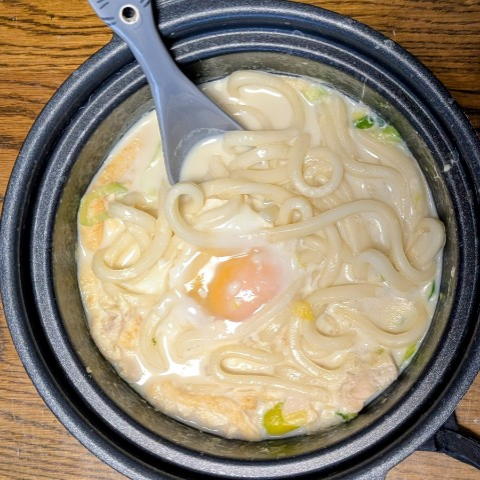昨晩の白鍋の残りでおうどん。カルボナーラみたいでとてもおいしいです。ありがとうございます。