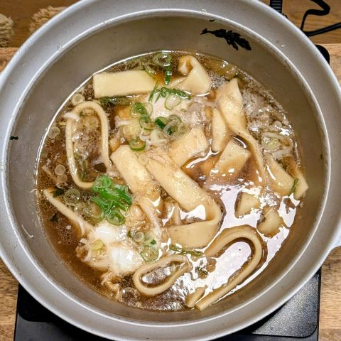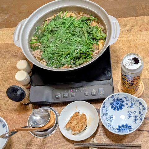 我が家の八大鍋の1つ「上州鍋」。普段は豚バラ肉なのですが、伴侶さんが牛肉が食べたいと言うので牛バラ肉にしました。また旬の春菊も入れました。