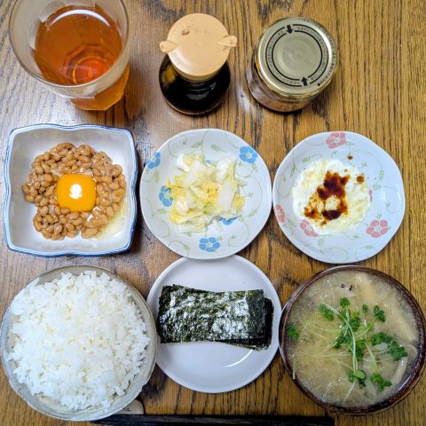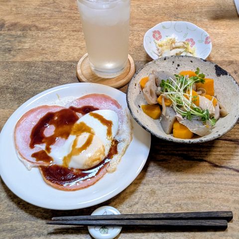 昨日の手羽元の筑前煮の残りとハムエッグ。