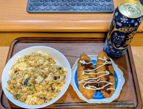 今日の占いのラッキーメニューが麻婆春雨でしたので、作ってみました。タラフライは買ってきたものです。