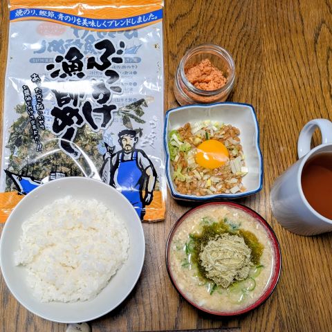 朝ごはんのようなお昼ごはん。納豆がおいしいです。ありがとうございます。