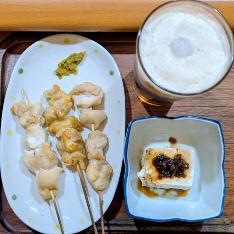 4時過ぎからは軽く晩酌。夕ごはん用に買った鳥胸肉の一部で、焼き鳥(正肉と皮)を作りました。冷や奴にはニラ醤油がかかっています。