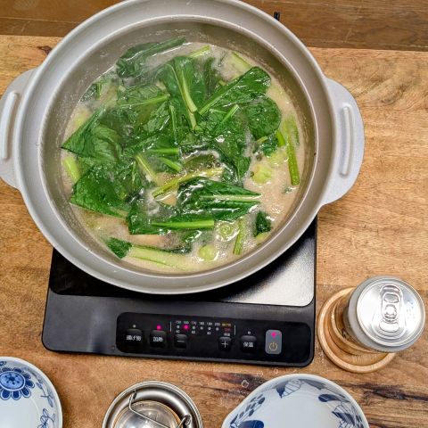 小松菜と鶏胸肉の常夜鍋。常夜鍋は、通常薄味にしてポン酢醤油などでいただくのですが、昨晩もポン酢でしたので、お醤油を足しました。
