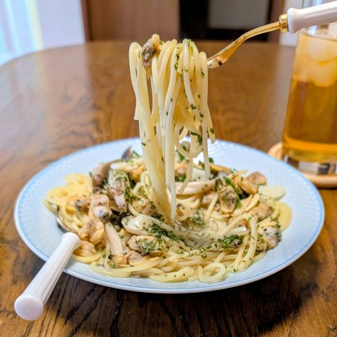 ボンゴレビアンコ風。「風」というのは、白ワインがなかったので。