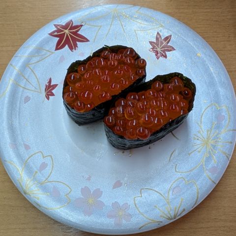 まずはイクラ。今年は高値なのでおいそれと食べられないのですが(魚市場でも高くて手が出ませんでした)、お寿司のお値段は例年どおりでした。ありがたいことです。