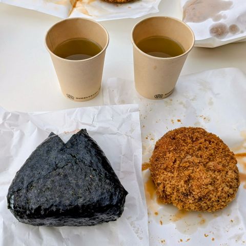 めんたいパーク名物ジャンボおにぎりと鳥惣のメンチカツ。おにぎりは焼さば面体おにぎりにしました。おいしいお昼ごはん、ありがとうございます。