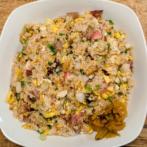 チャーシューが若干傷んでいたようなのですが、もったいないので、昨日チンしてから冷凍しておいておきました。それと、昨日のご飯の残り、年越しそばに入れるために刻んでいたのに存在を忘れ去られていたおネギ、カマボコ、明太子、数の子を入れて、お節炒飯を作りました。これもまたおいしい。ありがとうございます。