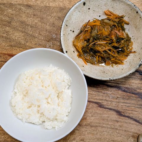 ご飯を炊いて、夕食です。まずは炊きたてご飯で松前漬けを味わいました。当然おいしい。ありがとうございます。