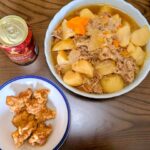 キムチ鍋。残っていた豚肉を使うためにセレクトした料理ですが、豚肉が少なかったので、かさ増しにお豆腐と糸こんにゃくを入れました。